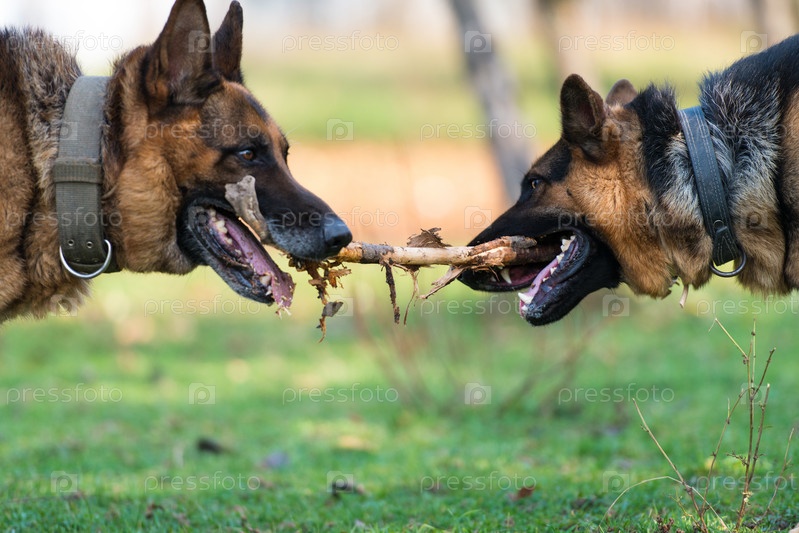Две собаки сражаются за палку