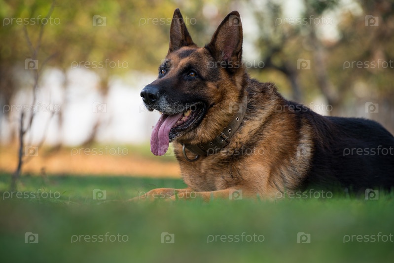 Немецкая овчарка лежит на траве
