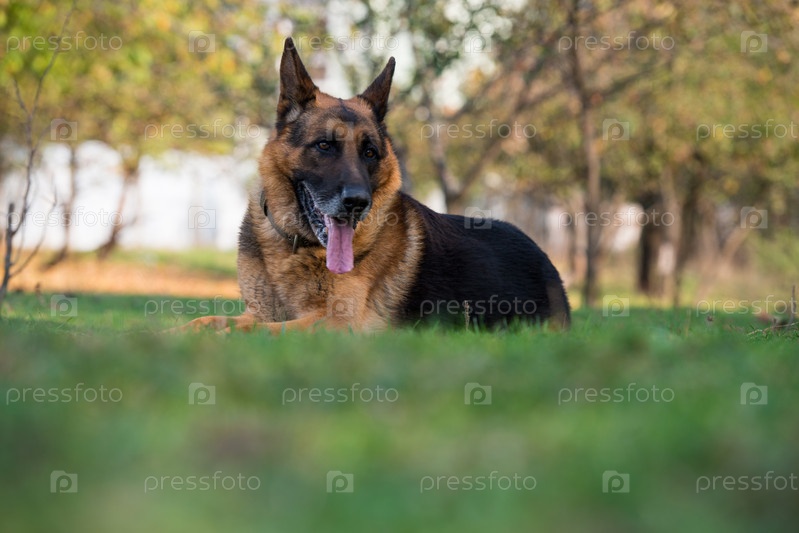 Немецкая овчарка лежит на траве