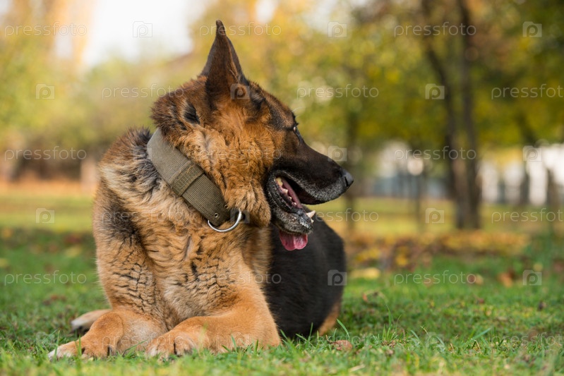 Немецкая овчарка лежит на траве