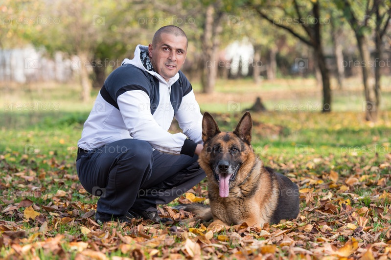 Взрослый мужчина сидит рядом с немецкой овчаркой в парке