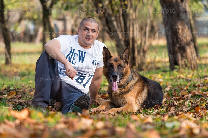 Взрослый мужчина сидит рядом с немецкой овчаркой в парке