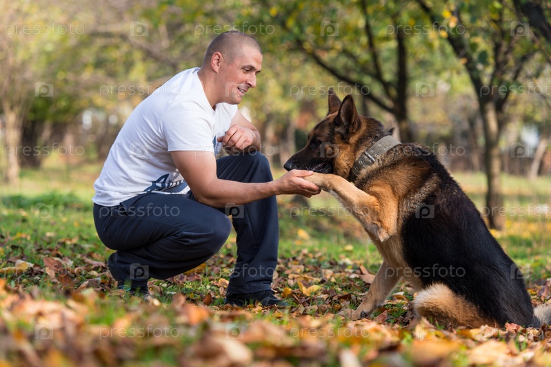 Взрослый мужчина сидит рядом с немецкой овчаркой в парке