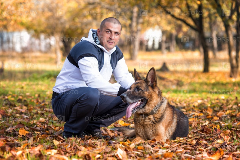 Взрослый мужчина сидит рядом с немецкой овчаркой в парке