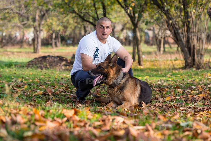 Взрослый мужчина сидит рядом с немецкой овчаркой в парке