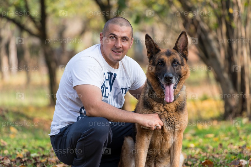 Взрослый мужчина сидит рядом с немецкой овчаркой в парке