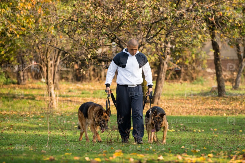 Взрослый мужчина гуляет с немецкими овчарками