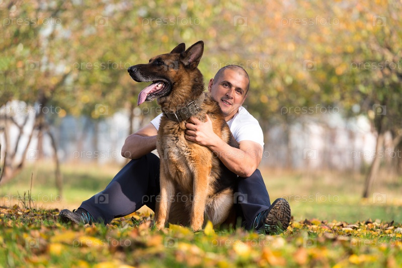 Взрослый мужчина сидит рядом с немецкой овчаркой в парке