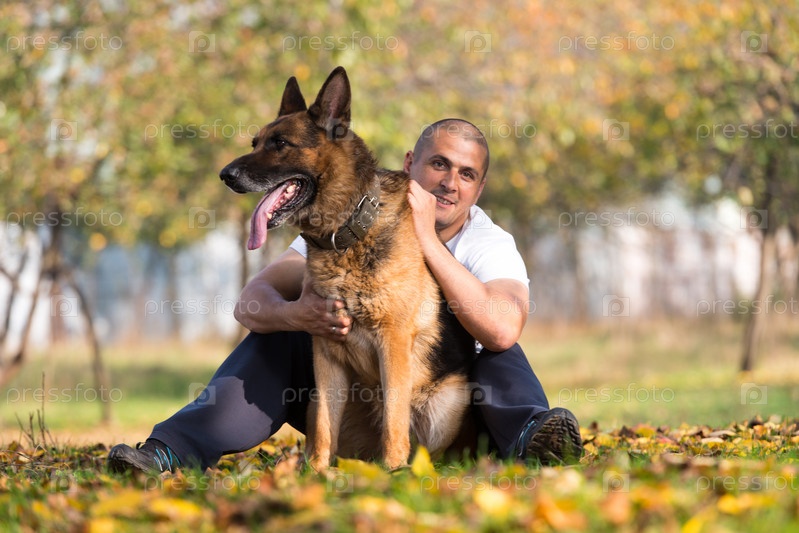 Взрослый мужчина сидит рядом с немецкой овчаркой в парке