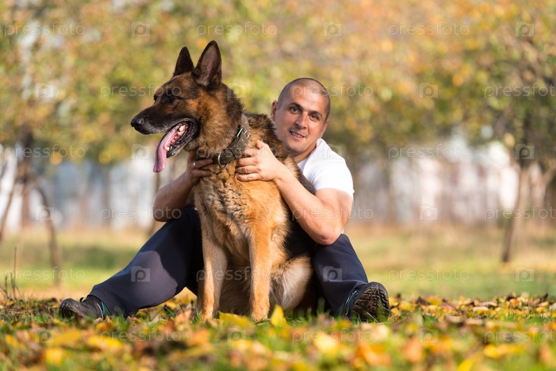 Взрослый мужчина сидит рядом с немецкой овчаркой в парке