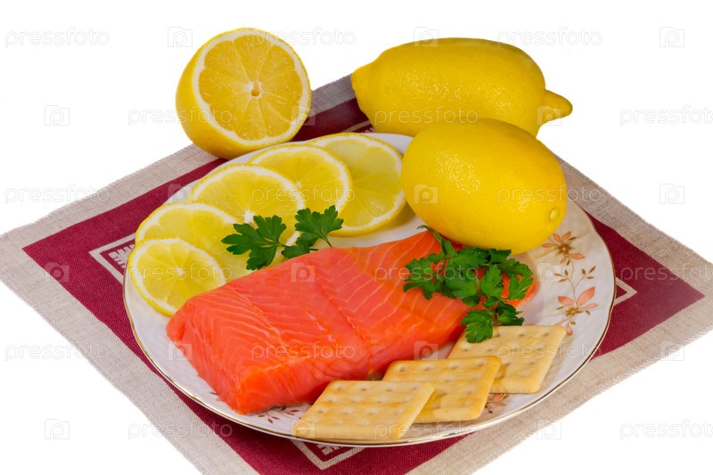 Филе лосося и лимон на блюде на белом фоне