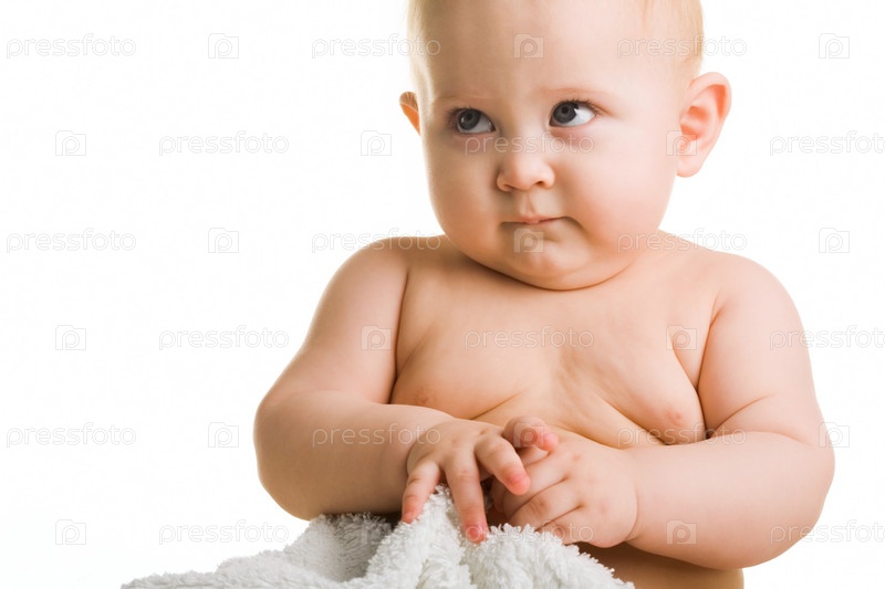 Фото очаровательного ребенка, который серьезно смотрит в сторону на белом фоне