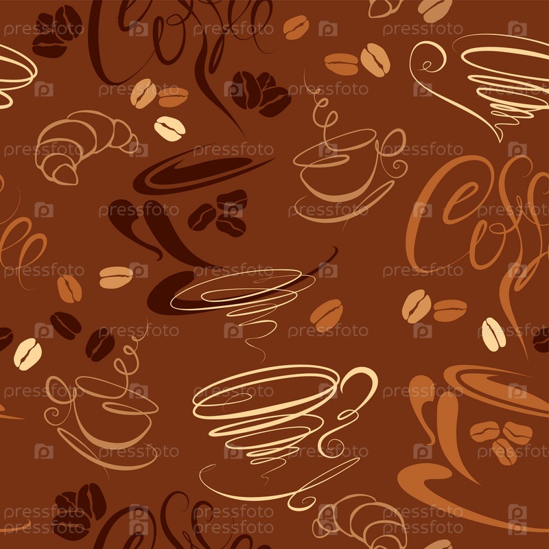 Бесшовный фон с чашками кофе, бобами, круассанами. Каллиграфический текст