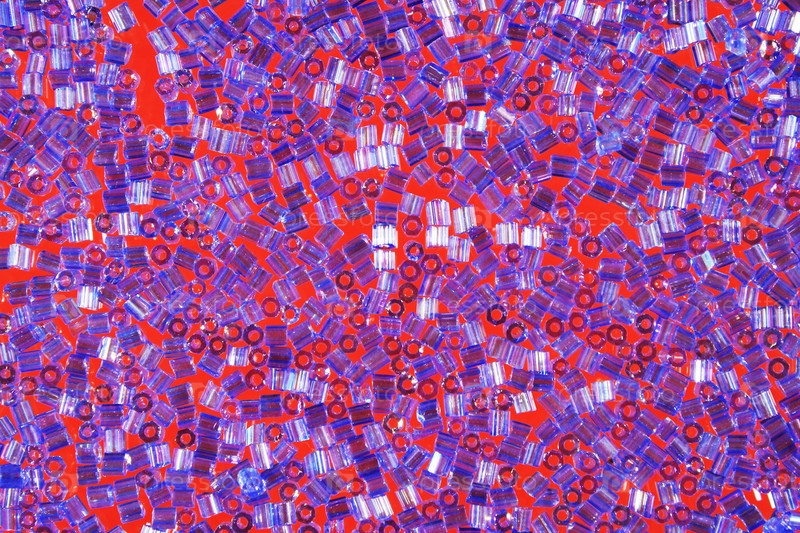 Стеклянные бусы разбросаны по стеклу. Близкий план. Красный фон