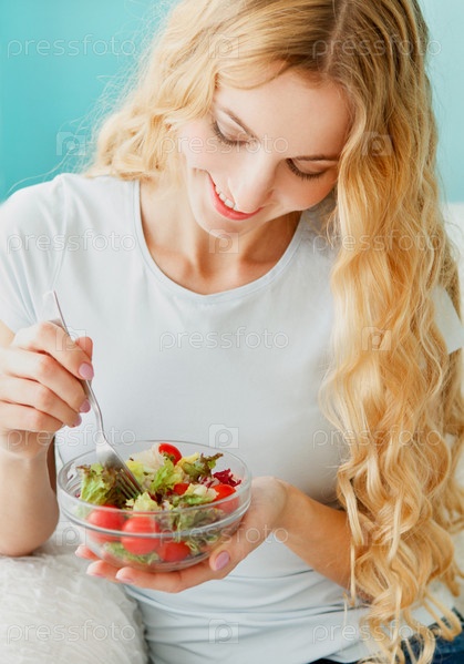 Модель ест зеленый салат