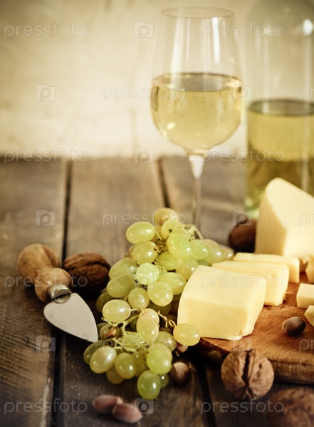 Бокалы белого вина, сыр, орехи и виноград