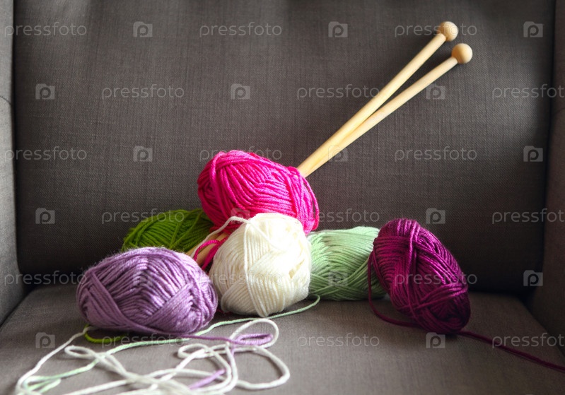 Красочные клубки пряжи на сером кресле