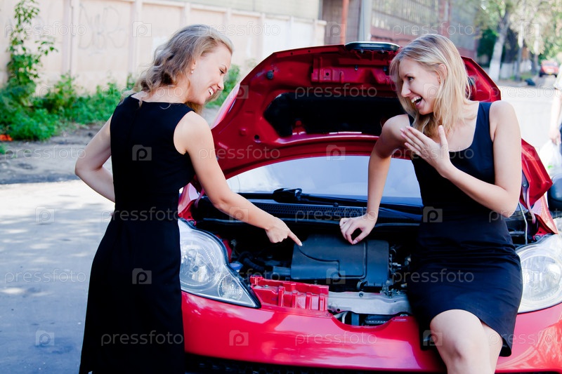 Две молодые красивые женщины и сломанный автомобиль