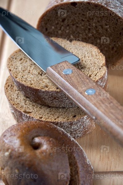 Нарезанный черный хлеб и нож на разделочной доске крупным планом
