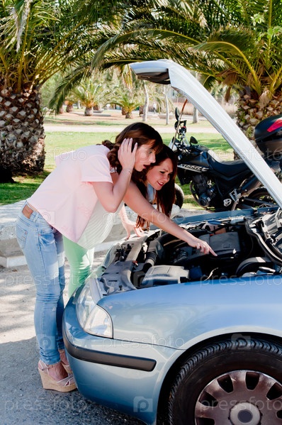 Две молодые красивые женщины и сломанный автомобиль