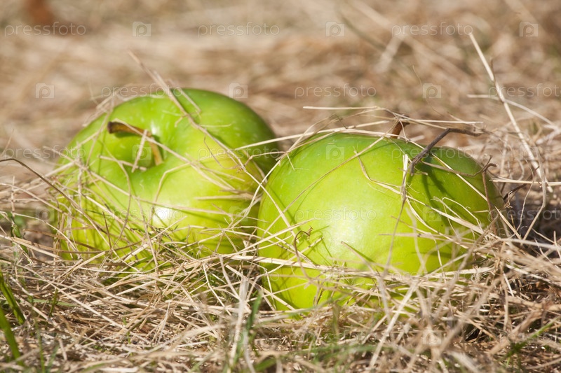 Зеленые яблоки в саду на траве прошлого года