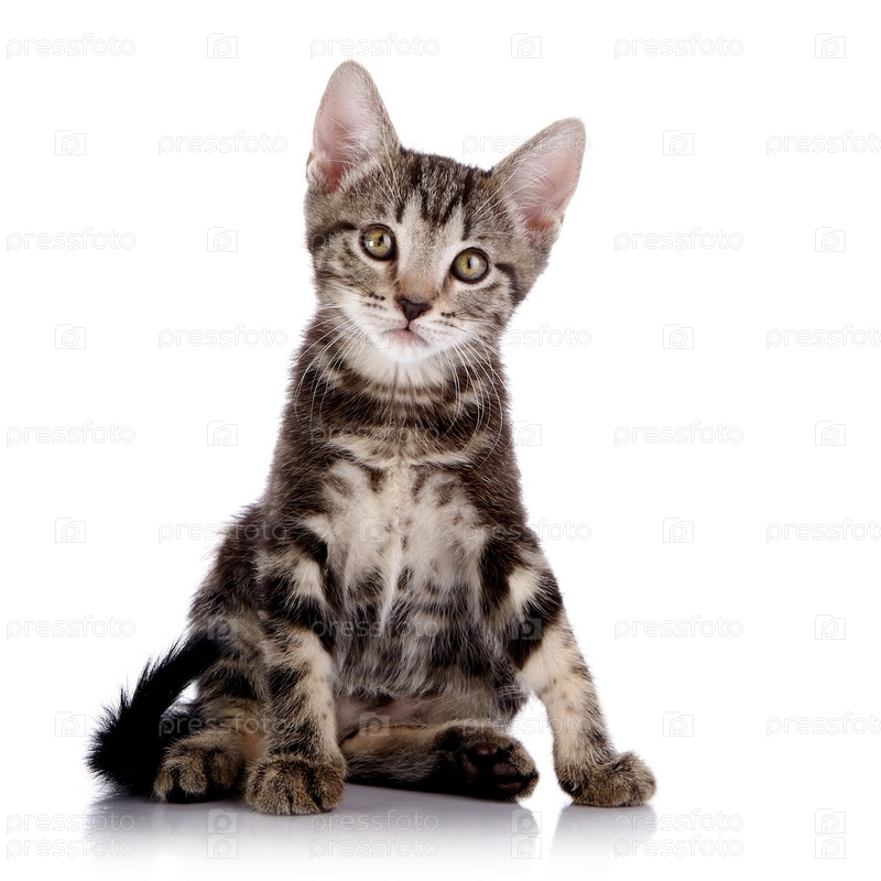 Полосатый котенок сидит на белом фоне