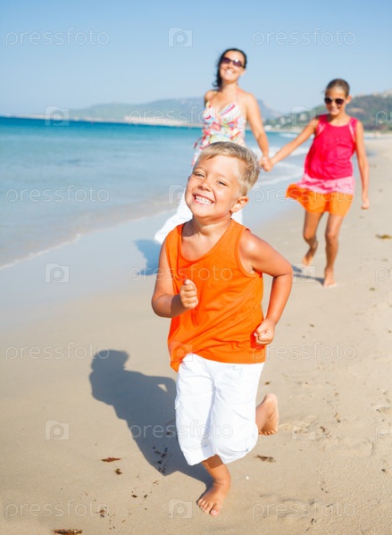 Милый мальчик с сестрой и матерью на пляже