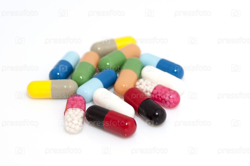 Горсть разных капсул на белом фоне