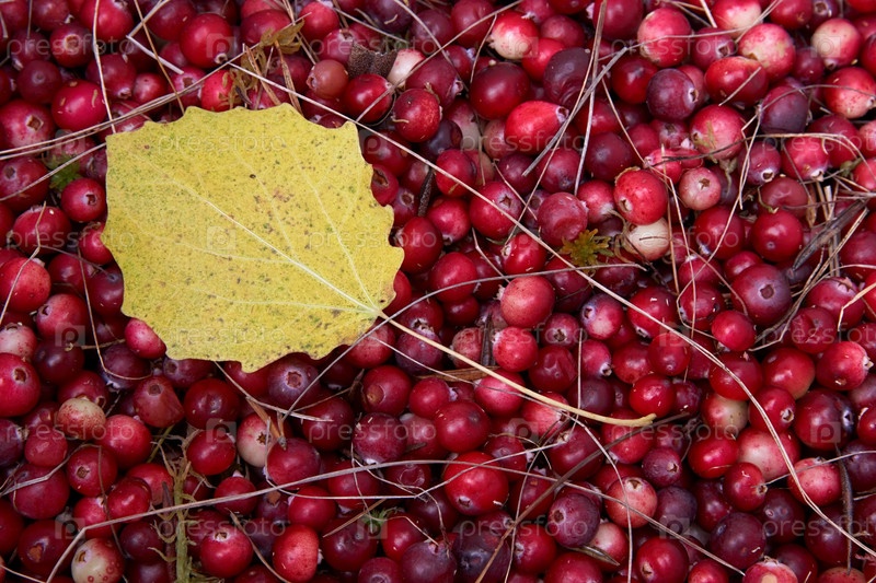 Куча диких клюквенных с желтым листьем осины
