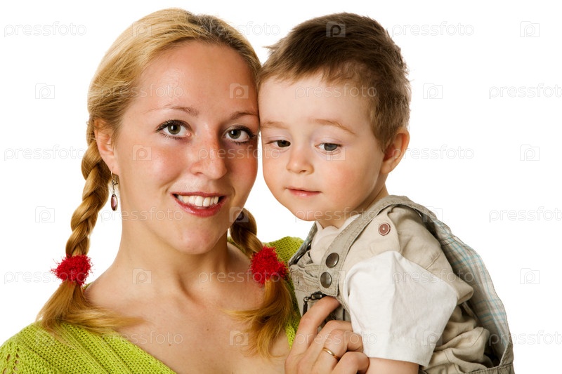 Счастливая мать с ребенком на белом фоне