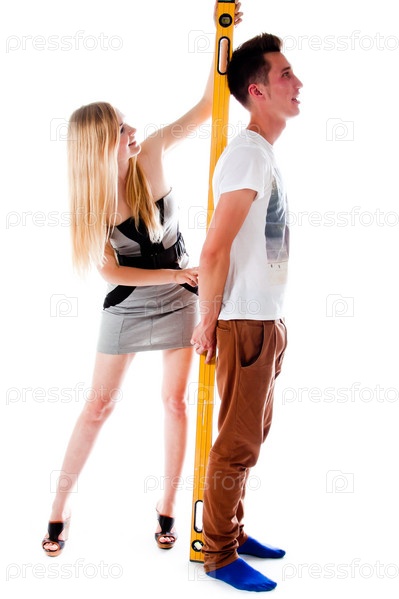 Красивая женщина измеряет рост молодого мужчины