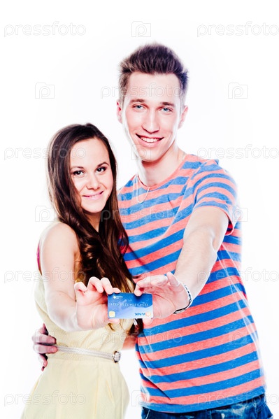 Пара молодых красивых людей с пластиковой карточкой