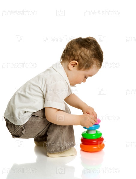 Маленький мальчик играет с пирамидкой на белом фоне