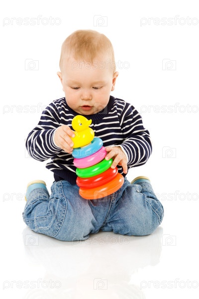 Маленький мальчик играет с пирамидкой на белом фоне