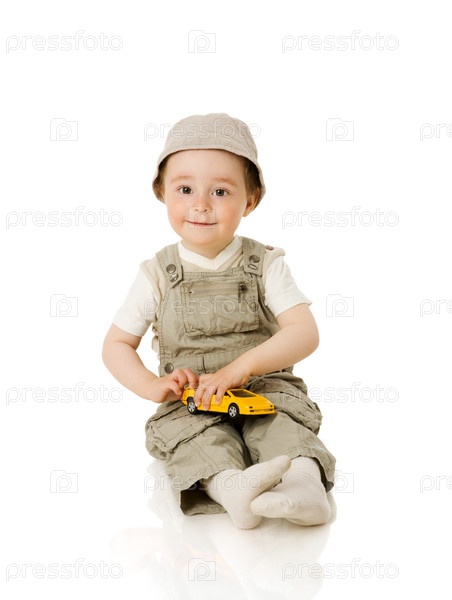 Маленький мальчик играет с машинкой на белом фоне