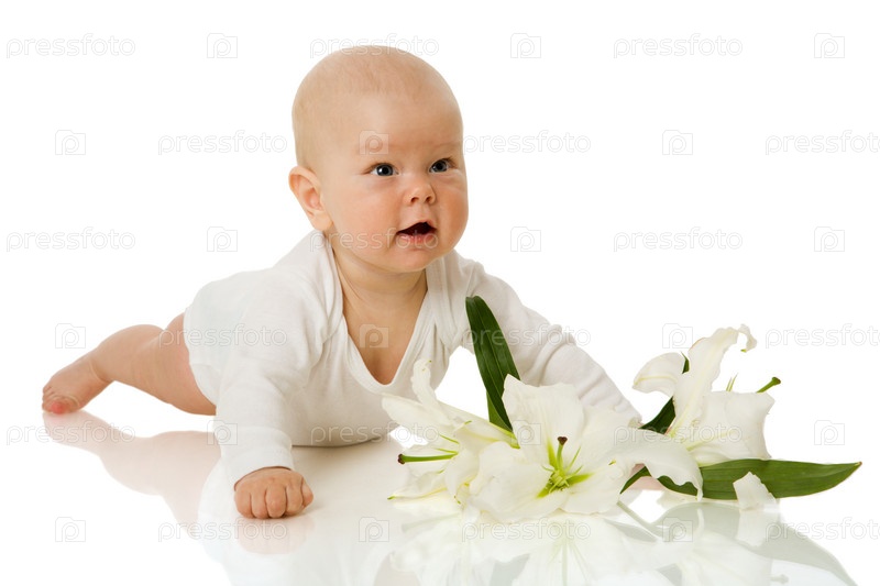 Малышка с цветами на белом фоне