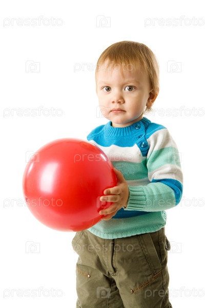 Маленький мальчик с красным шариком на белом фоне