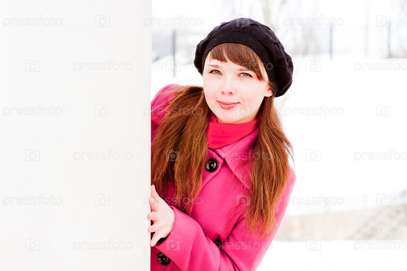 Портрет молодой симпатичной девушки у белой колонны в парке