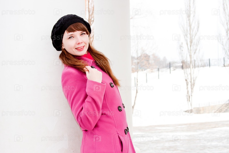 Портрет молодой симпатичной девушки у белой колонны в парке