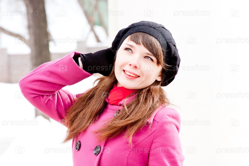 Портрет молодой симпатичной девушки у белой колонны в парке