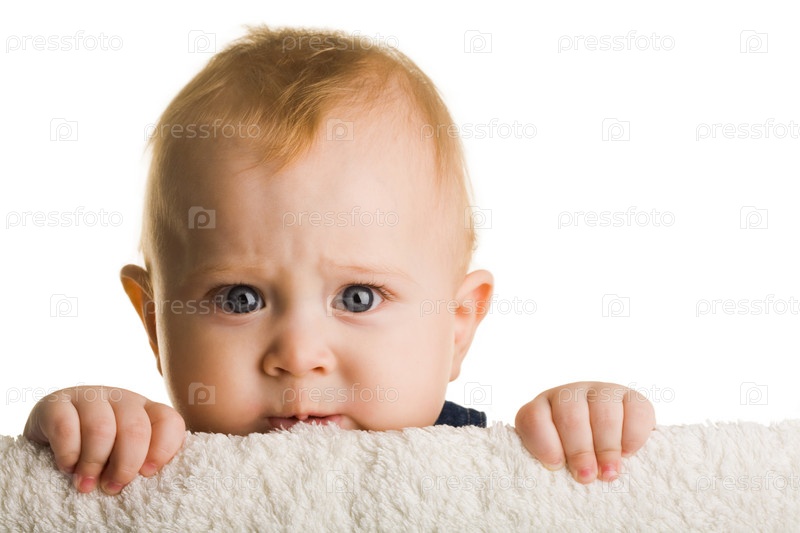 Лицо очаровательного ребенка, заглядывающего из барьера на белом фоне