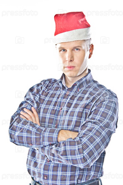 Молодой красивый мужчина в новогоднем колпаке