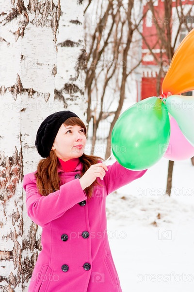 Портрет молодой симпатичной девушки с разноцветными шарами в зимнем парке