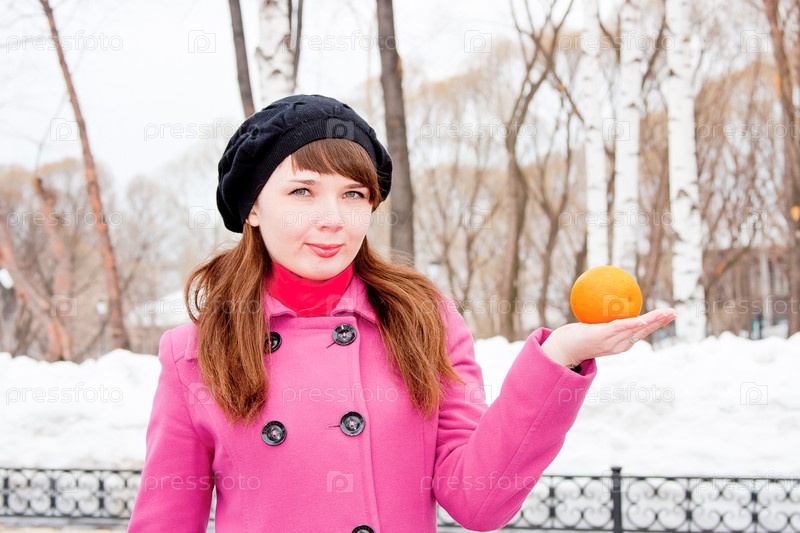 Портрет молодой симпатичной девушки со спелым апельсином на фоне зимнего парка