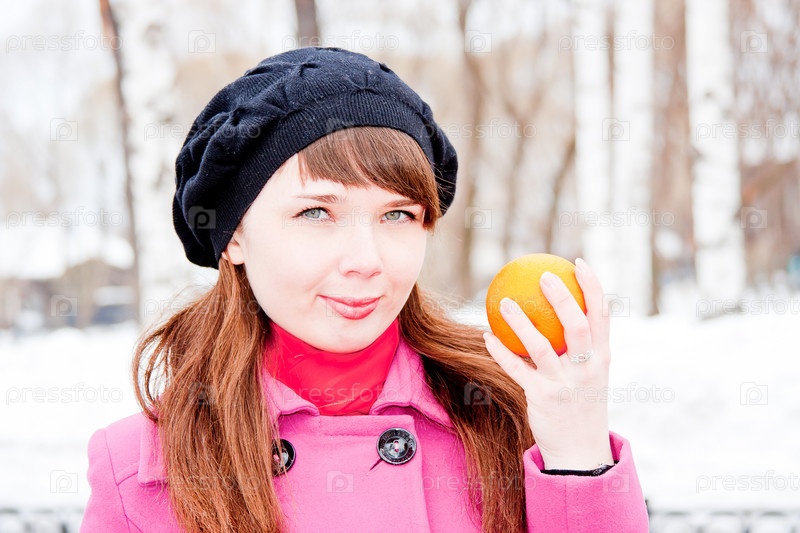 Портрет молодой симпатичной девушки со спелым апельсином на фоне зимнего парка