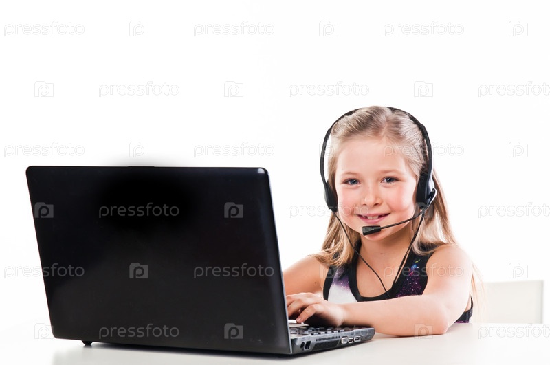 Маленькая красивая девочка с ноутбуком и гарнитурой