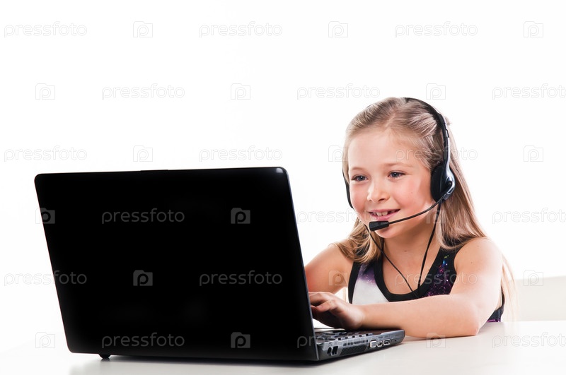 Маленькая красивая девочка с ноутбуком и гарнитурой