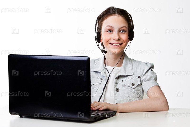 Девушка с ноутбуком и гарнитурой