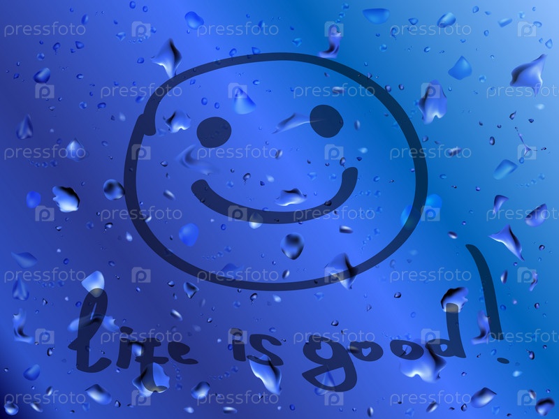 Фон. Позитивное мышление: смайлик и надпись "Жизнь хороша" на мокром стекле