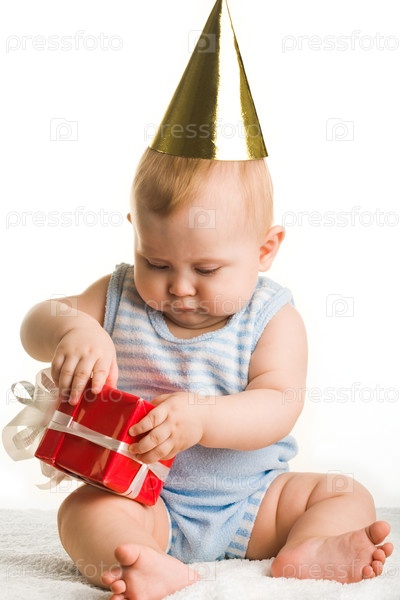 Фото очаровательного ребенка, держащего подарок на день рождения в руках